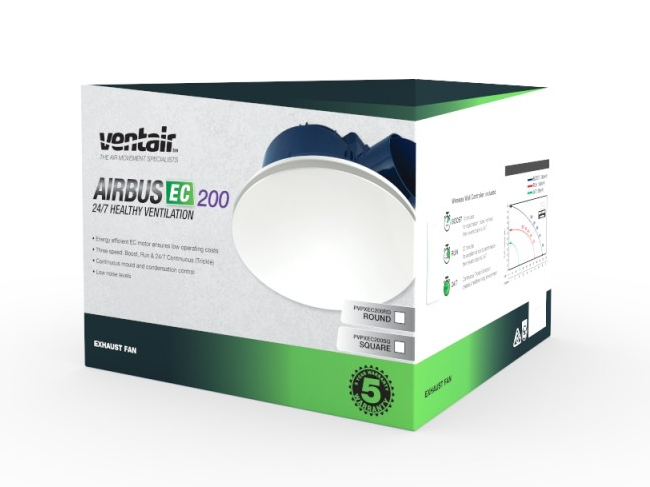 Airbus EC 200 Round Exhaust Fan- Designed for 24/7 Continuous Healthy Ventilation, side ducted exhaust fan with wireless wall controller included.