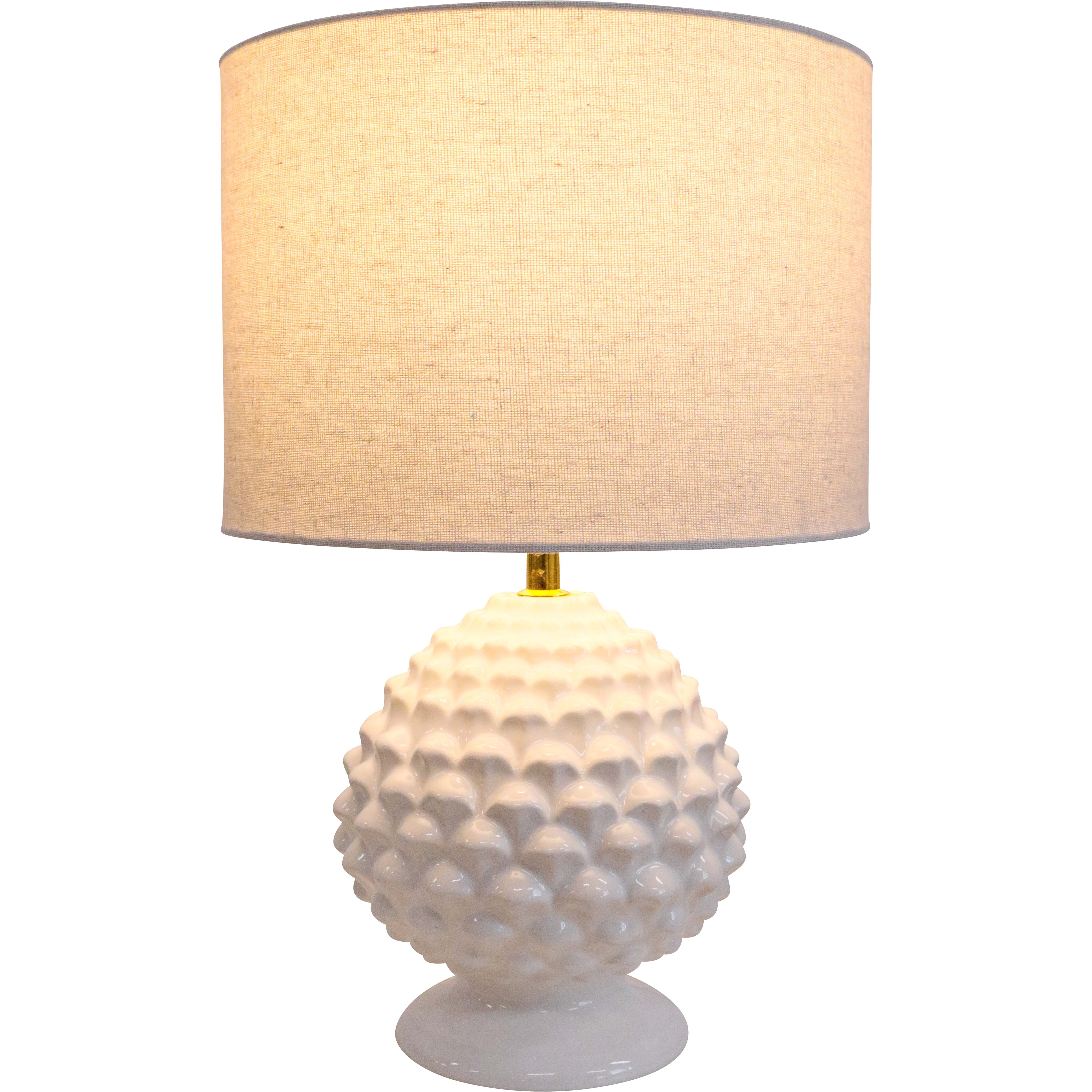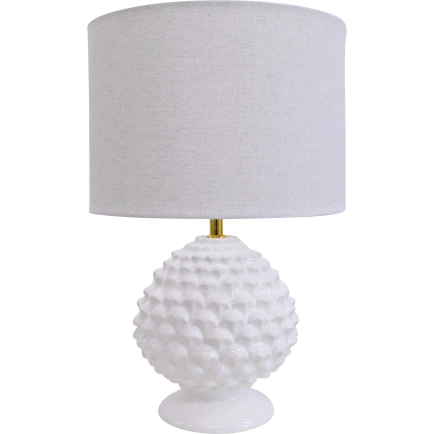 The Artichoke White table lamp features a gloss artichoke shaped ceramic base, topped with a white fabric drum shade. Also available in a larger size.