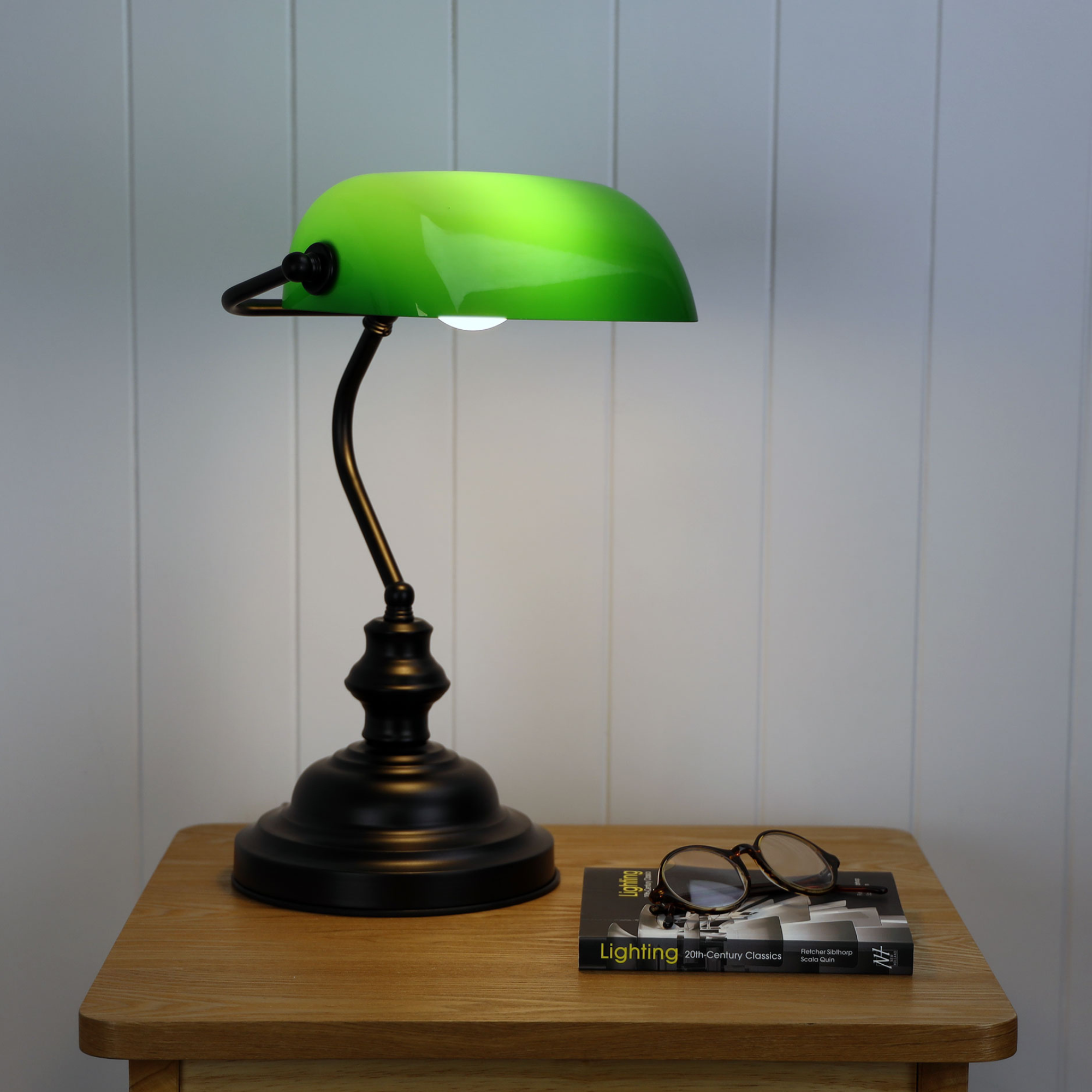 Bankers Switch Black/Green Lamp is inspired by the traditional banker’s lamp, this updated version features a bold black base paired with a rich green glass shade—an elegant combination that brings vintage charm to modern spaces.