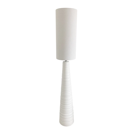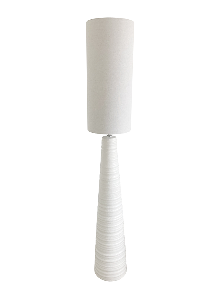 The Belize floor lamp is a very tall and striking lamp. The textured, organic ceramic base it topped with a very long slender light shade which will create a lovely mood lighting effect. Available in black and white. THIS PRODUCT IS NOT AVAILABLE FOR SHIPPING DUE TO HIGH RISK OF DAMAGE TO THE SHADE. IN-STORE ONLY PURCHASE.