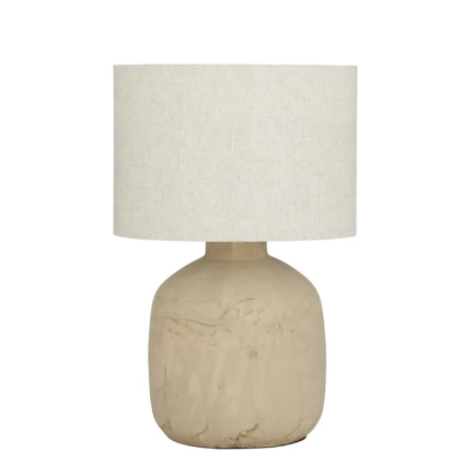 The earthy aesthetic of the Bexley table lamp brings a sense of rustic beauty to interior living spaces. The organic ceramic surface resembles natural stone and is complemented by the warm glow from the fabric drum shade. THIS PRODUCT IS NOT AVAILABLE FOR SHIPPING DUE TO HIGH RISK OF DAMAGE. IN-STORE ONLY PURCHASE.