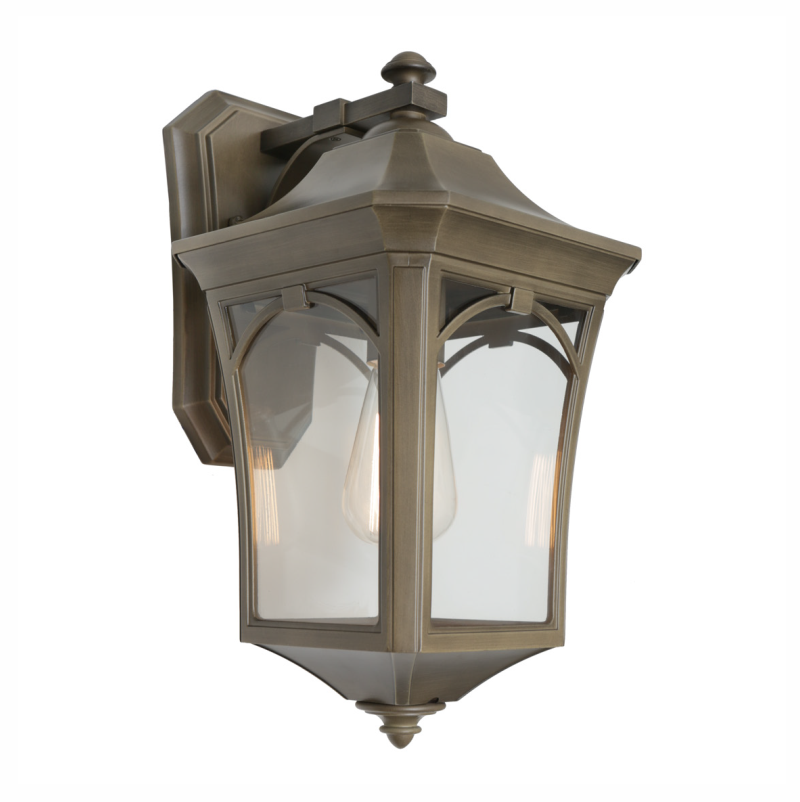 The Burston Bronze Coach Light is an exterior wall light. It is a Bronze finish with clear curved glass. Please note this is a vertical mount only. Available in large & small. Suitable for coastal conditions.