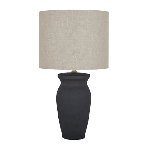 The Corallo charcoal table lamp features a tall textured base topped with a natural fabric drum shade. It’s height will add an interesting lighting feature to any bedroom or living area of the home. THIS PRODUCT IS NOT AVAILABLE FOR SHIPPING DUE TO HIGH RISK OF DAMAGE TO THE SHADE. IN-STORE ONLY PURCHASE.