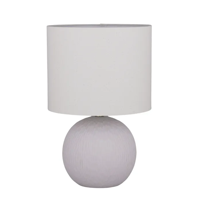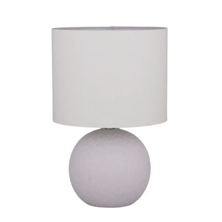 The Corallo taupe table lamp features a rounded textured base topped with a white fabric drum shade. It’s neutral tones will suit many home decor styles and will add an interesting lighting feature to a bedroom or living area of the home. THIS PRODUCT IS NOT AVAILABLE FOR SHIPPING DUE TO HIGH RISK OF DAMAGE TO THE SHADE. IN-STORE ONLY PURCHASE.
