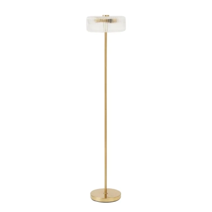 The Decluca is a unique and sophisticated floor lamp. With it's ribbed clear glass shade and gold metalware it will add a beautiful feature to any living area of the home. THIS PRODUCT IS NOT AVAILABLE FOR SHIPPING DUE TO HIGH RISK OF DAMAGE. IN-STORE ONLY PURCHASE.
