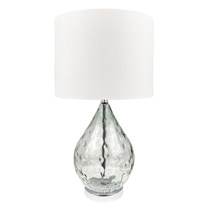 This table lamp features a dimpled clear glass base with visible silver metalware topped with a white fabric shade. This stylish & sophisticated lamp will suit home decor styles and will adding an interesting lighting feature. THIS PRODUCT IS NOT AVAILABLE FOR SHIPPING DUE TO HIGH RISK OF DAMAGE. IN-STORE ONLY PURCHASE.