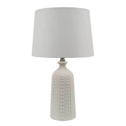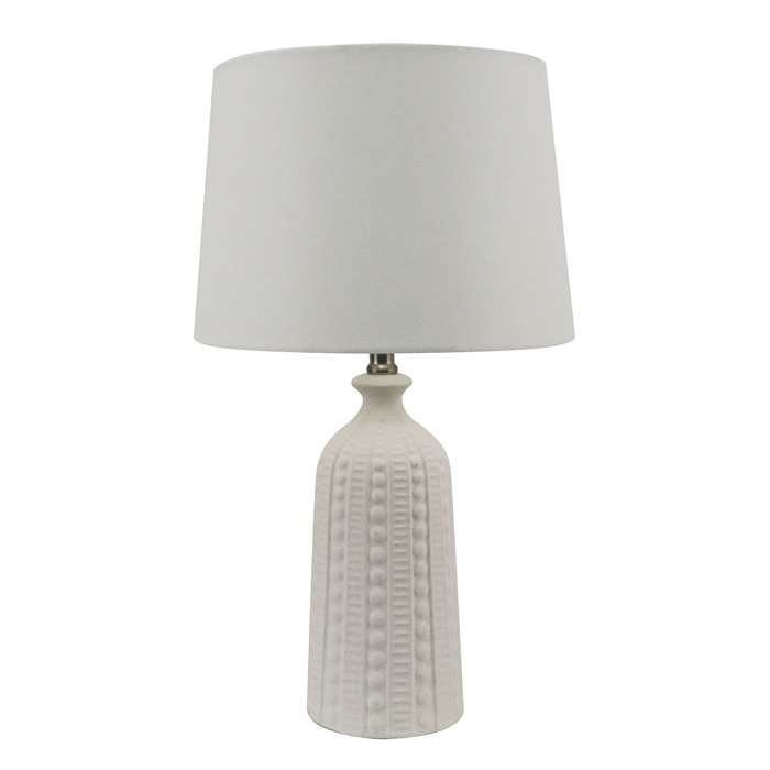 The Dimpled White Coast Table Lamp features a white tapered fabric shade on a gloss ceramic base. This textured dimpled look will add an interesting, yet subtle feature to any area of the home. THIS PRODUCT IS NOT AVAILABLE FOR SHIPPING DUE TO HIGH RISK OF DAMAGE. IN-STORE ONLY PURCHASE.