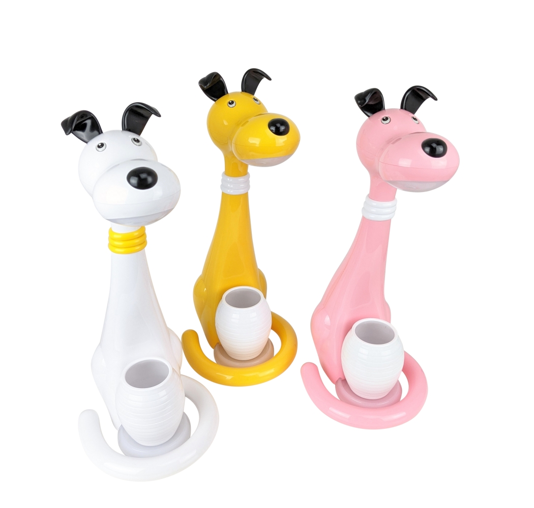 Dino the Dog Desk Lamp is a cute little 6 watt LED desk lamp which comes with a cute little pencil holder. It has a built in dimmer, adjustable via the dogs eyes. It also features colour switching technology allowing you to switch between 3000K Warm White, 4000K Natural White, and 6000K Cool White. It's the perfect study lamp or bedside reading lamps as you can choose the colour temperature you prefer. Another switch operates the little night light at the base of this desk lamp (the base of the cup holder lights up).