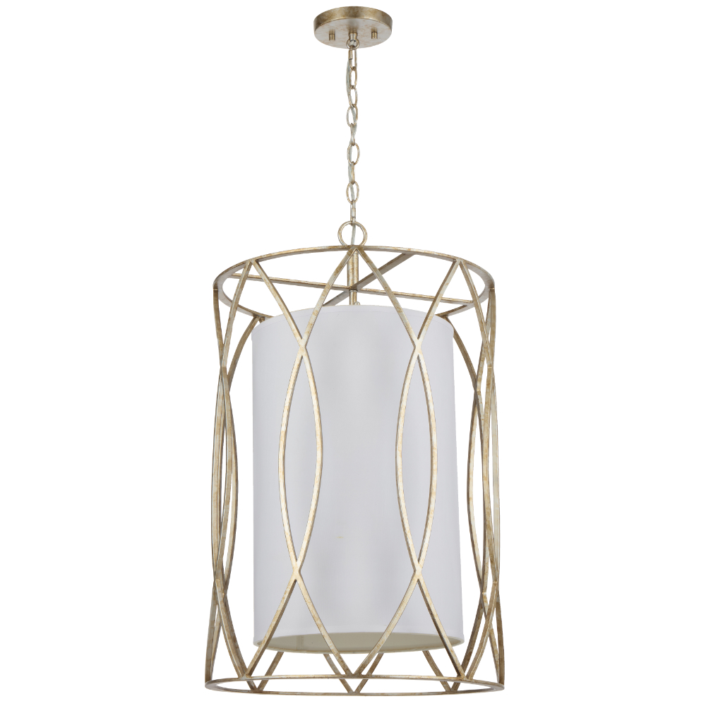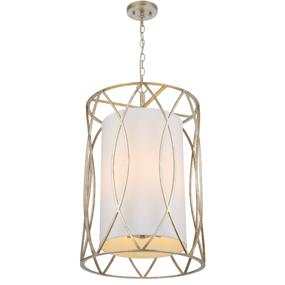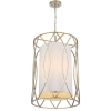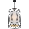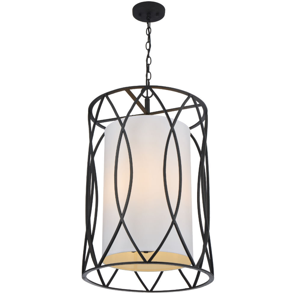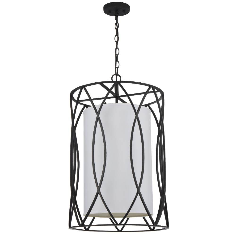 The Dover Pendant is a contemporary style pendant featuring an iron cage design and white fabric shade which diffuses light creating a warm and cozy atmosphere. Perfect over a dining table or in a hallway. Available in a black or silver frame finish.