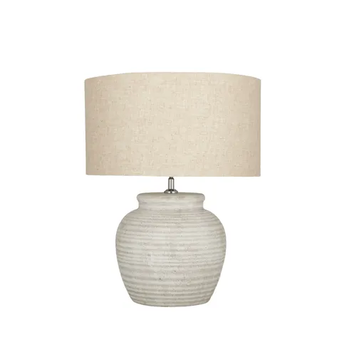 The Edi Table Lamp features a grey textured ceramic base and natural fabric shade. Perfect as a bedside lamp, or side table in a living room for ambient lighting. THIS PRODUCT IS NOT AVAILABLE FOR SHIPPING DUE TO HIGH RISK OF DAMAGE. IN-STORE ONLY PURCHASE.