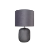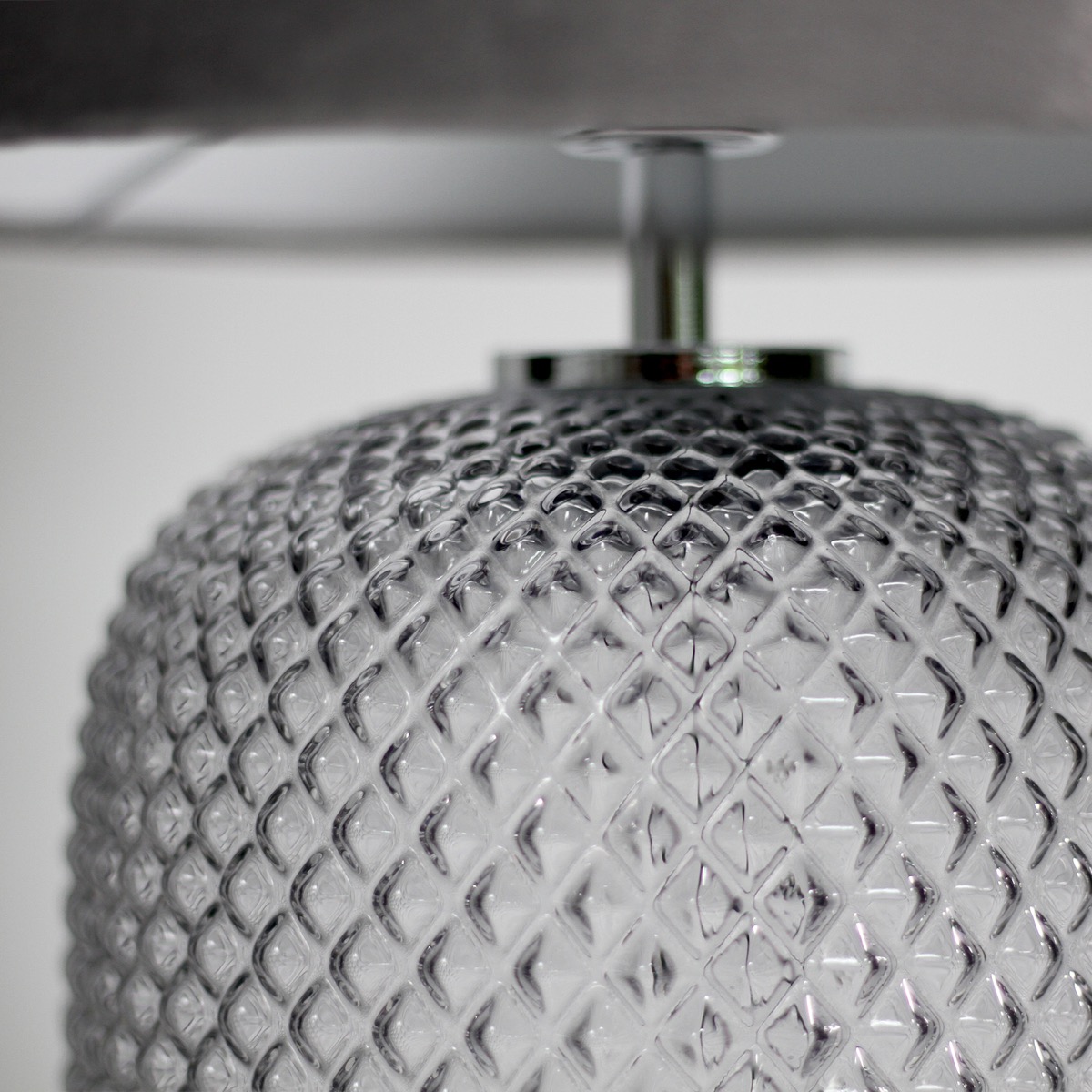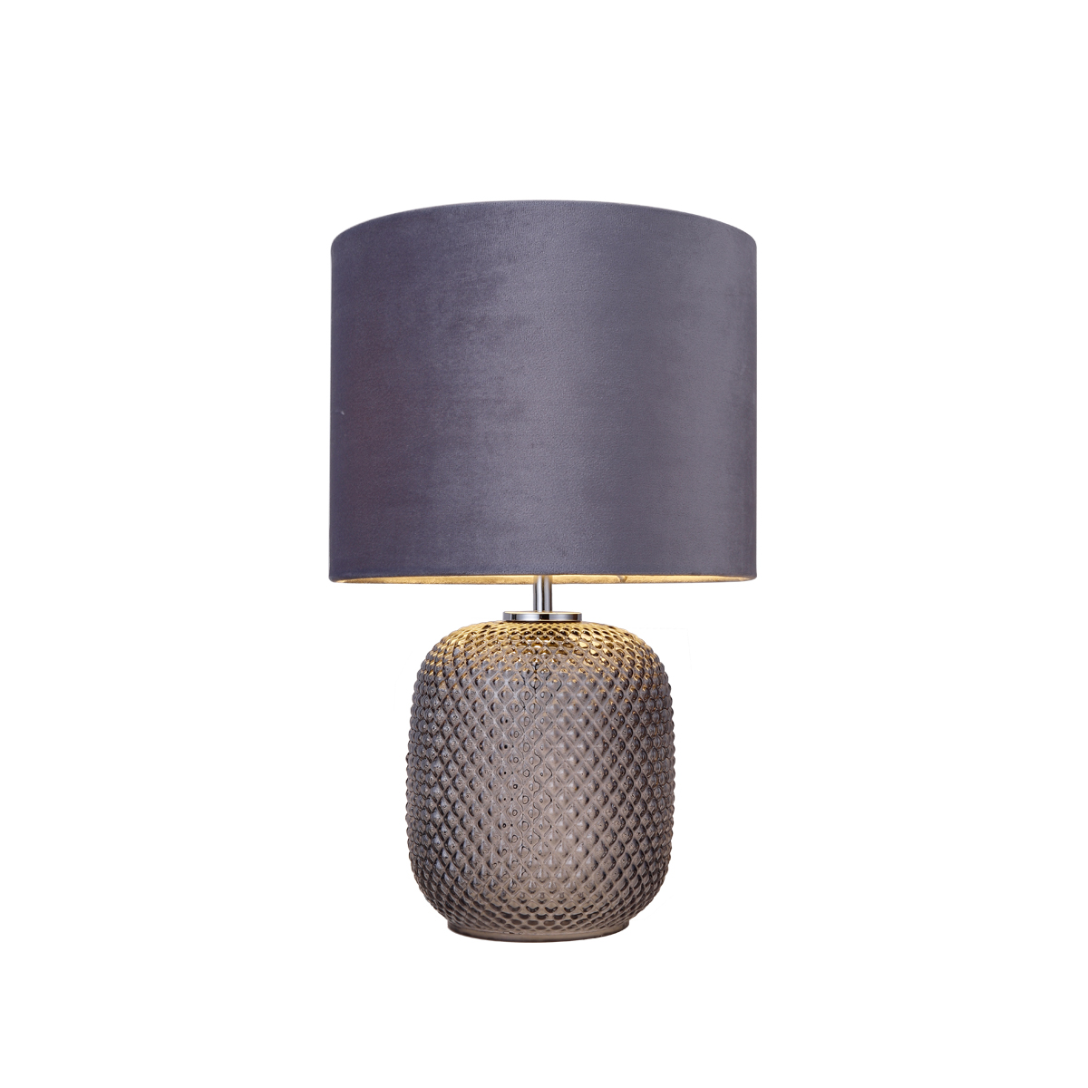 The Elvira is a stylish smokey grey table lamp. It features a dimpled smokey glass base and is topped with a grey velvet shade. It will suit a modern home decor style in any bedroom or living area of the home. THIS PRODUCT IS NOT AVAILABLE FOR SHIPPING DUE TO HIGH RISK OF DAMAGE. IN-STORE ONLY PURCHASE.