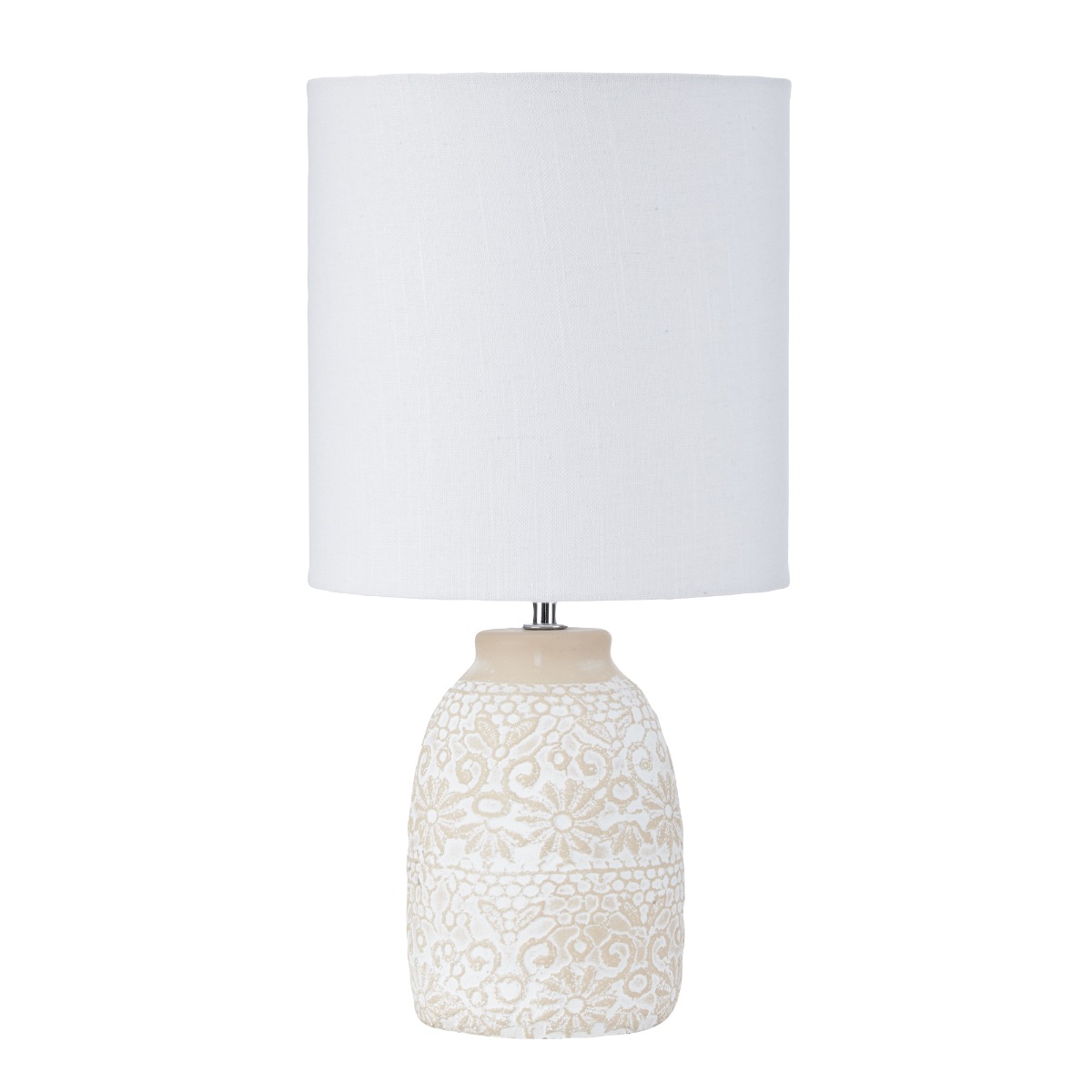 Fleur Table Lamp will brighten your day in more ways than one! It features a detailed body and smooth silhouette, complemented by a white fabric shade. The base is crafted from glazed concrete with beige and whitewash paint detailing. Decorative table lamps are perfect for elevating any space – try placing this lamp on a desk, bedside table, office shelf and more. THIS PRODUCT IS NOT AVAILABLE FOR SHIPPING DUE TO HIGH RISK OF DAMAGE. IN-STORE ONLY PURCHASE.