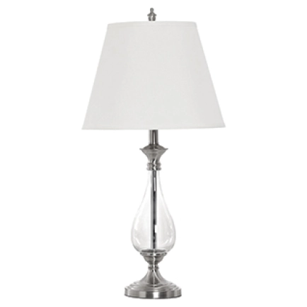 The Bloomingdale glass base is a sophisticated table lamp featuring brushed silver metalware to compliment clear glass shapely base. It's white drum shade enables it to suit many home decor styles including Hampton's, modern or traditional. It will add a stunning feature to any living area of the home and create a soft mood light. THIS PRODUCT IS NOT AVAILABLE FOR SHIPPING DUE TO HIGH RISK OF DAMAGE. IN-STORE ONLY PURCHASE.
