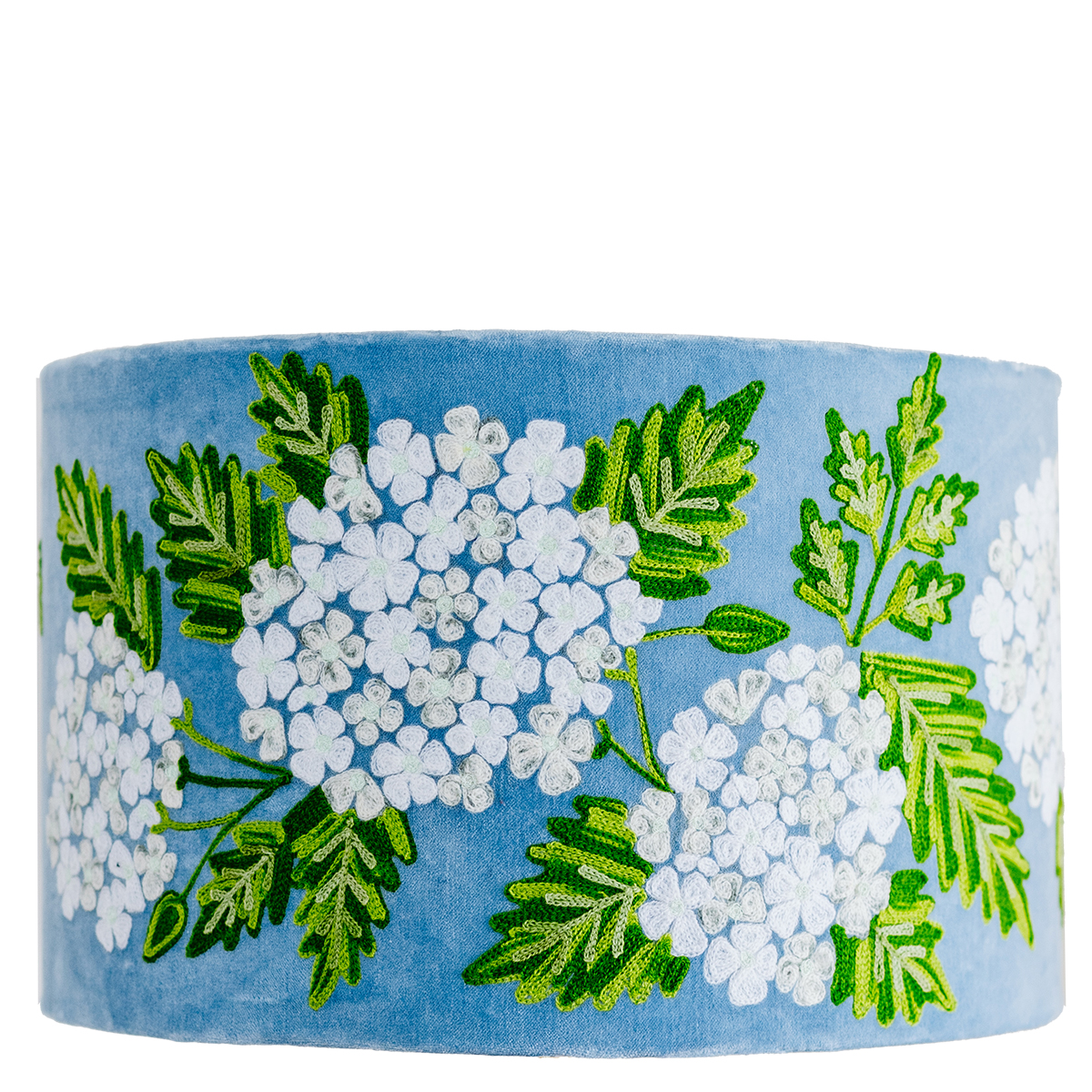 This SHADE ONLY is detailed with a floral pattern on a velvet drum shade. Perfect to combine with your own table lamp base or select from our range of bases only. This beautifully hand stitched lamp shade is purchased from the traditional craft regions in India, where these products are produced by craftsmen working in traditional workshops. COLOURS CAN CHANGE THEIR TONE IN A PHOTOGRAPH - there's nothing like seeing the real thing so we suggest you shop in our showroom for this range.