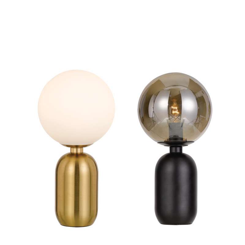 The Kade table lamp is a modern lamp with a metal base and a round glass shade, it comes in two colours, aged gold with a matte opal glass shade, and matte black with a smoke glass shade.