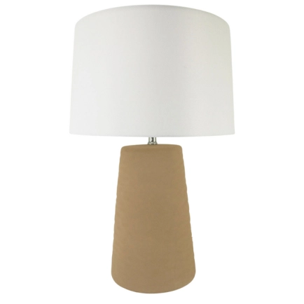 The Kima table lamp features a large tan/orange organic textured base topped with a white fabric shade. It’s add a large, interesting lighting feature to a bedroom or living area of the home. THIS PRODUCT IS NOT AVAILABLE FOR SHIPPING DUE TO HIGH RISK OF DAMAGE TO THE SHADE. IN-STORE ONLY PURCHASE.