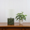 The Kai green textured ceramic table lamp comes complete with a fabric drum shade. This designer lamp is perfect for a bedside or study nook in a coastal or hamptons styled home. The on/off switch is located on the cord. THIS PRODUCT IS NOT AVAILABLE FOR SHIPPING DUE TO HIGH RISK OF DAMAGE TO THE SHADE. IN-STORE ONLY PURCHASE.
