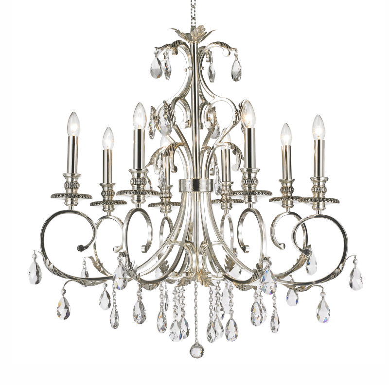 The Magnolia collection features beautiful crystals, and intricate frame details. Available in multiple sizes and a wall sconce. Perfect for over a dining table or grand entrance.