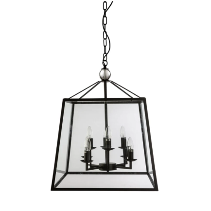 The Marka 8 Light Pendant is a Black & Glass Lantern Light that brings elegance to any room. It is suspended with black chain.