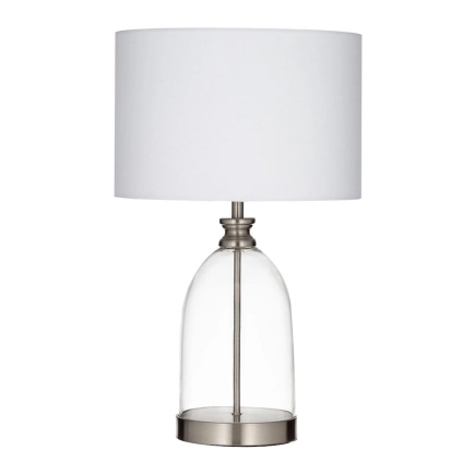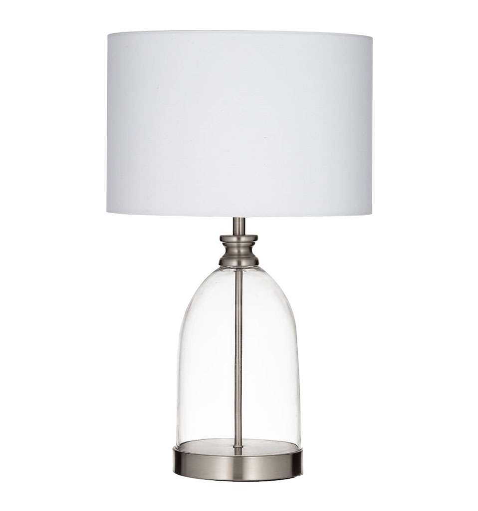 The Marlow features a clear glass base with chrome metalware and is coupled with a white fabric drum shade. It's the perfect addition to any traditional Hampton's inspired home and will add an elegant touch to any bedroom or living area of the home.