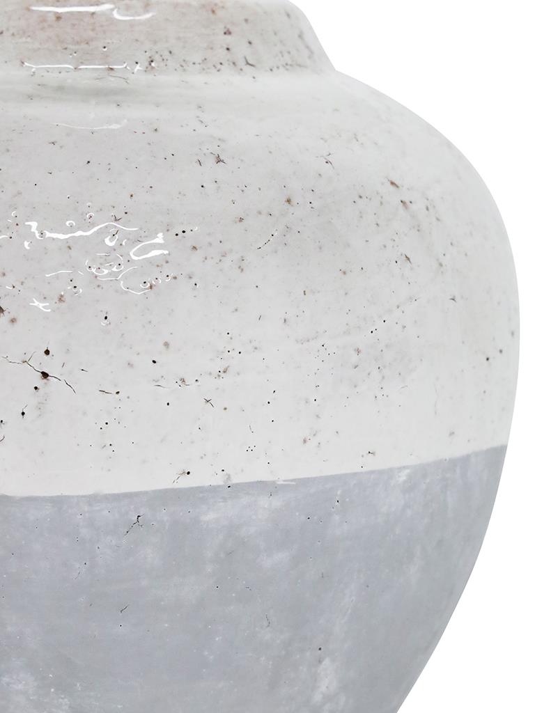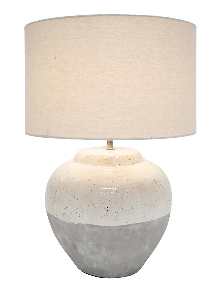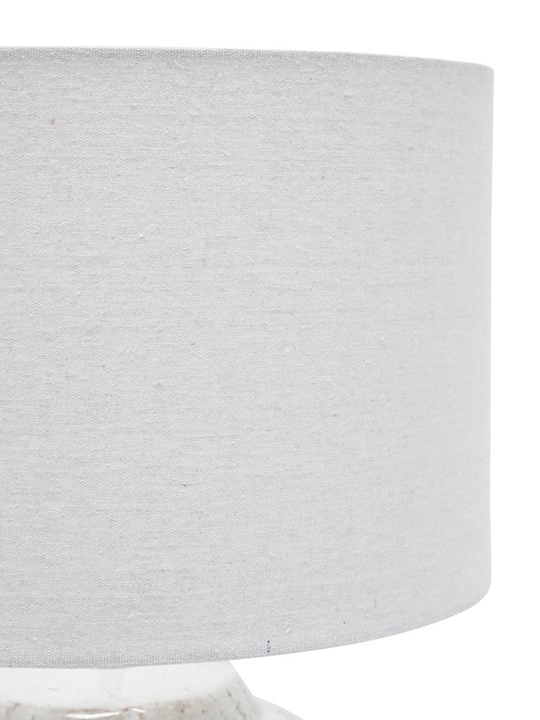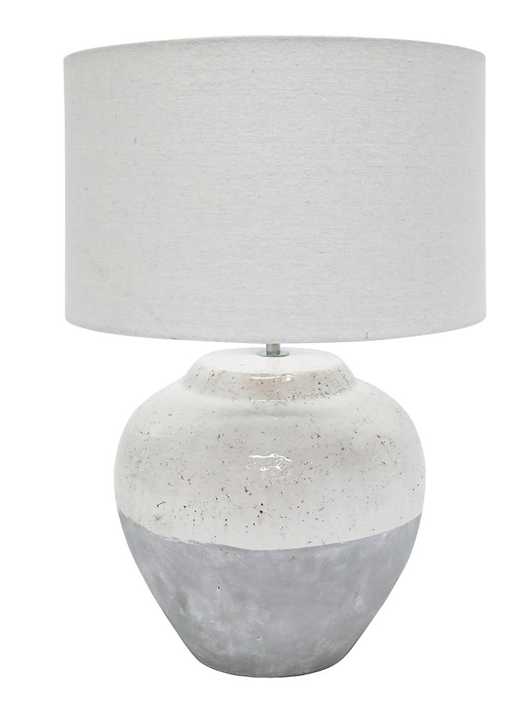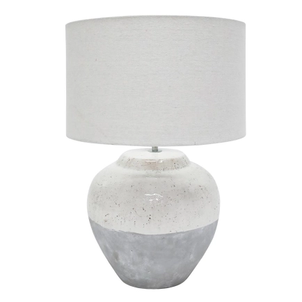 The Millie White Grey is a heavy rustic table lamp which will make a feature in any area of the home. It's base features white gloss ceramic mixed with grey wash tones. Coupled with it's white drum shade it will suit many home decor styles. THIS PRODUCT IS NOT AVAILABLE FOR SHIPPING DUE TO HIGH RISK OF DAMAGE TO THE SHADE. IN-STORE ONLY PURCHASE.