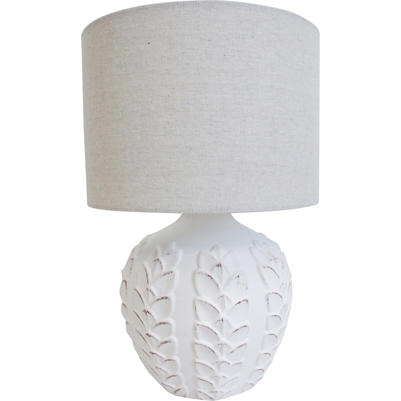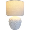 The Orchid White table lamp is a textured white ceramic, topped with a natural fabric drum shade.