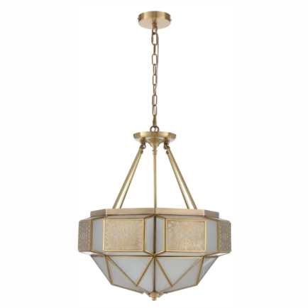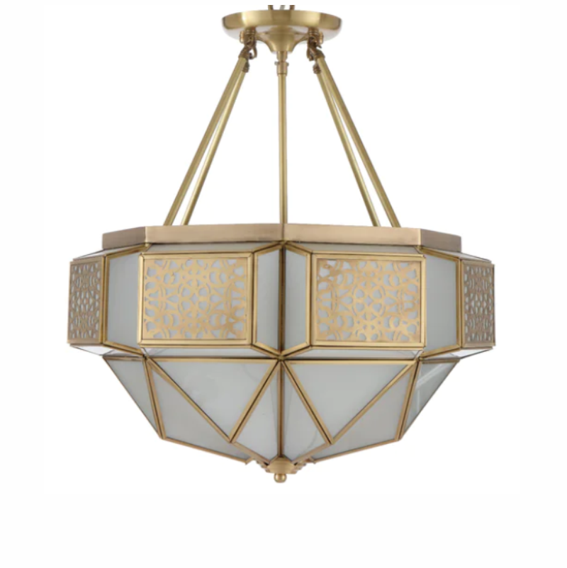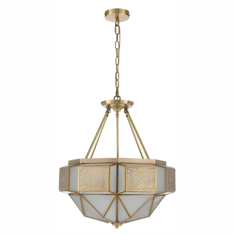 The Overton Artisan Brass Pendant Light is a masterpiece of design and craftsmanship. Its upper tier showcases a stunning lattice pattern crafted from solid brass, elegantly overlaying the acid-frost glass. Handcrafted to perfection, this pendant light combines the durability of brass with the soft, diffused glow of acid frost glass. It's a captivating fusion of artistry and function, a testament to timeless beauty. Illuminate your space with the enchanting allure of the Overton Pendant and watch as it transforms your surroundings into a work of art. Can be mounted as close to ceiling