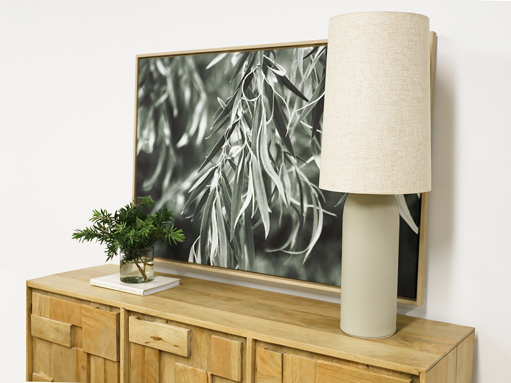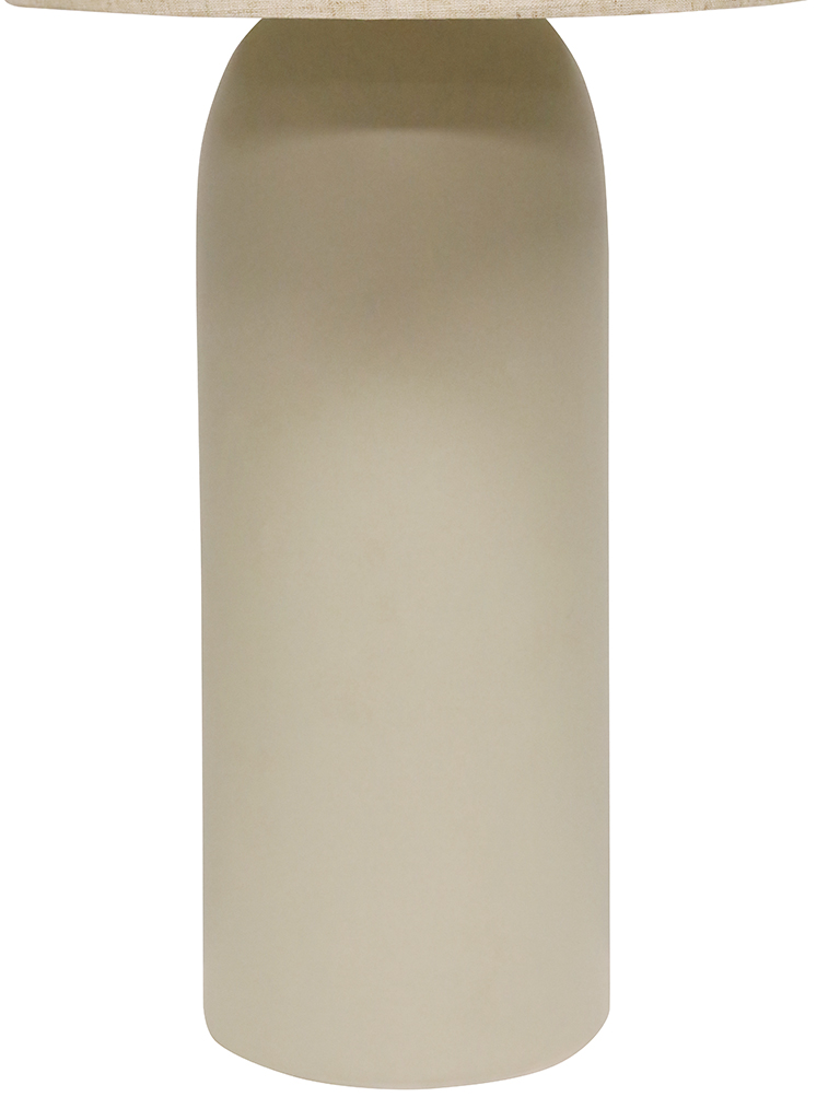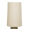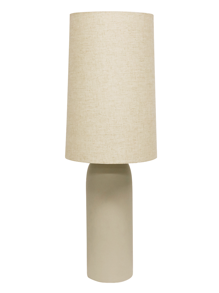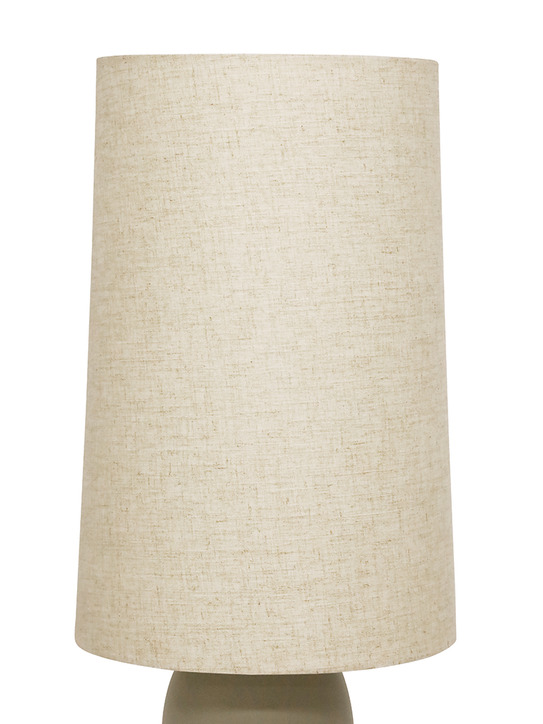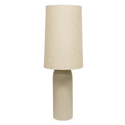 The Rhodes Table Lamp is a tall statement piece. It has a beautiful long ceramic body in a grey tone base. The slender natural fabric shade complements it perfectly. Display around your home for a sophisticated approach. THIS PRODUCT IS NOT AVAILABLE FOR SHIPPING DUE TO HIGH RISK OF DAMAGE TO THE SHADE. IN-STORE ONLY PURCHASE.