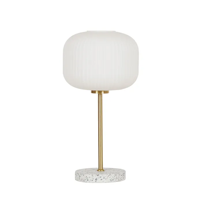 The Rocco table lamp is a stunning, sophisticated table lamp. The base features terrazzo with a gold-coloured stand to complement the white ribbed glass. Place around your home for a lovely lighting feature. THIS PRODUCT IS NOT AVAILABLE FOR SHIPPING DUE TO A HIGH RISK OF DAMAGE. IN-STORE PURCHASE ONLY.