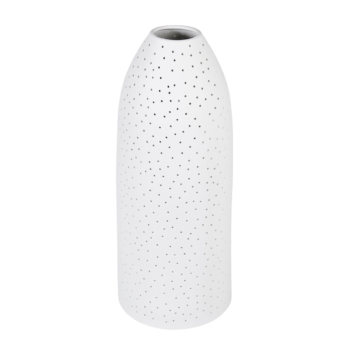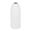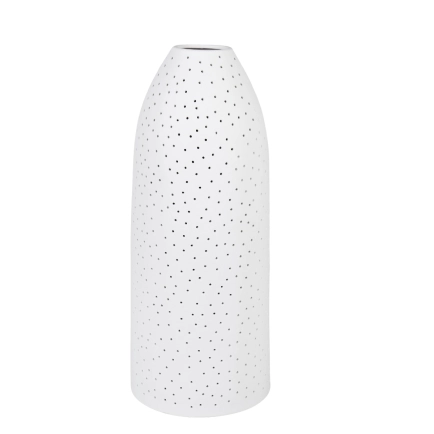 Salma table lamp is crafted from porcelain in a pure white finish, it features a cylindrical flat-based shade with a tapered top and dotted surface.. The coastal-inspired design is a stylish and practical statement piece in any home. Place it on a bedside table, desk or console to create a comfortable reading or working nook. THIS PRODUCT IS NOT AVAILABLE FOR SHIPPING DUE TO HIGH RISK OF DAMAGE. IN-STORE ONLY PURCHASE.