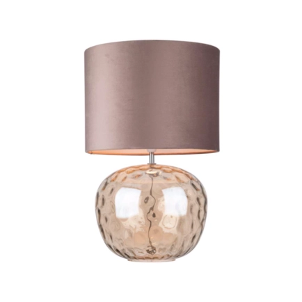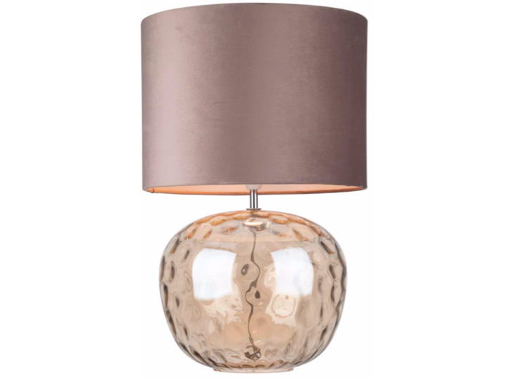 The Selena table features a rounded, dimpled glass base in amber, with a luxurious blush velvet fabric shade. Perfect as a bedside lamp, or on a console or side table for mood lighting while watching TV.