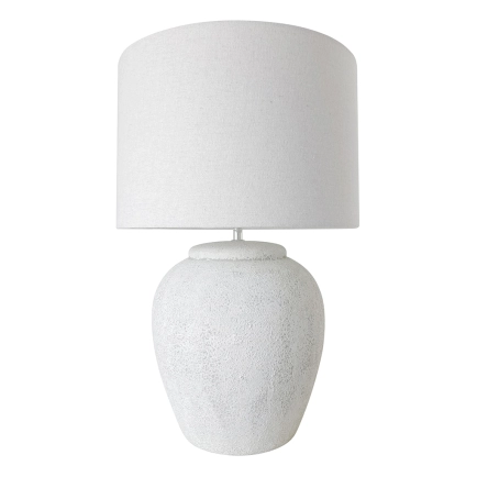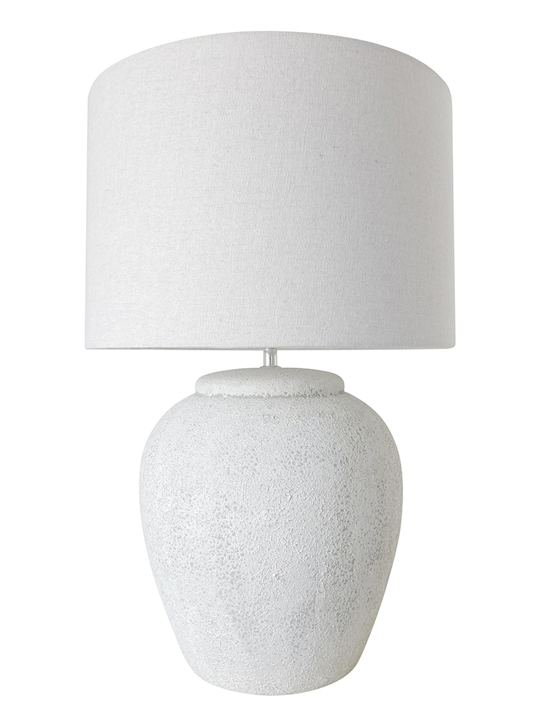 The Seona Lamp comes in a rustic white ceramic finish and features a lovely white drum shade. It will provide a lovely lighting feature to any room in the home. Also available in a smaller size. THIS PRODUCT IS NOT AVAILABLE FOR SHIPPING DUE TO HIGH RISK OF DAMAGE. IN-STORE ONLY PURCHASE.