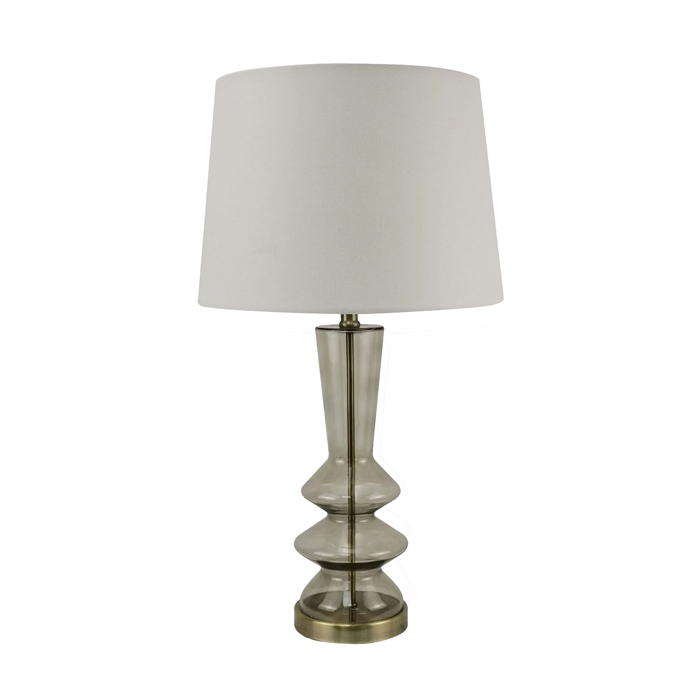 The Smoke Gold Double Waisted Sahara is a stylish smokey grey table lamp. It features a shapely smokey glass base and is topped with a white fabric shade. It will suit a modern home decor style in any bedroom or living area of the home. THIS PRODUCT IS NOT AVAILABLE FOR SHIPPING DUE TO HIGH RISK OF DAMAGE. IN-STORE ONLY PURCHASE.