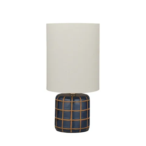 The Stella ceramic table lamp has a navy blue base with an embossed criss cross natural pattern and is topped with an white fabric shade. Pretty little bedside lamp or just as suitable in any living area of the home. THIS PRODUCT IS NOT AVAILABLE FOR SHIPPING DUE TO HIGH RISK OF DAMAGE TO THE SHADE. IN-STORE ONLY PURCHASE.