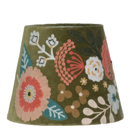This SHADE ONLY detailed with an olive green floral pattern on a velvet tapered drum shade. Perfect to combine with your own table lamp base or select from our range of bases only. This beautifully hand stitched lamp shade is purchased from the traditional craft regions in India, where these products are produced by craftsmen working in traditional workshops. COLOURS CAN CHANGE THEIR TONE IN A PHOTOGRAPH - there's nothing like seeing the real thing so we suggest you shop in our showroom for this range. THIS PRODUCT IS NOT AVAILABLE FOR SHIPPING DUE TO HIGH RISK OF DAMAGE. IN-STORE ONLY PURCHASE.