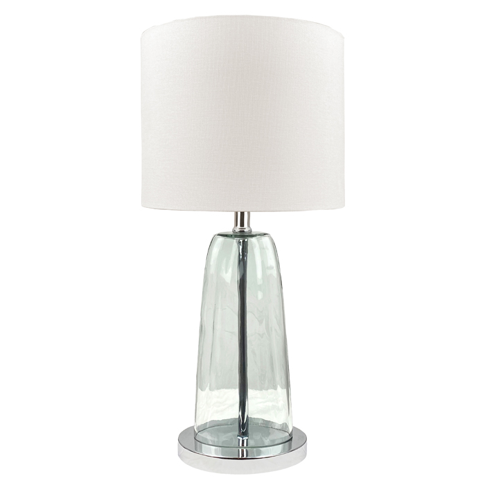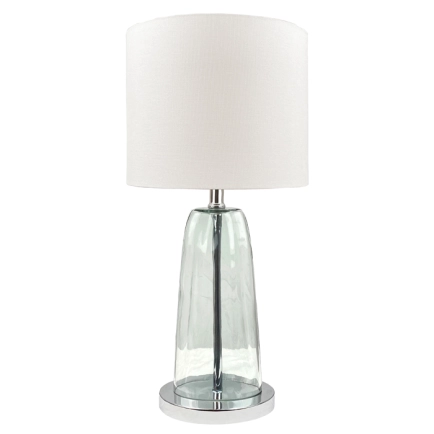 This table lamp features a clear glass base with visible silver metalware topped with a white fabric shade. This stylish & sophisticated lamp will suit any Hamptons style, modern or traditional home and will add an interesting lighting feature to a bedroom or living area of the home.