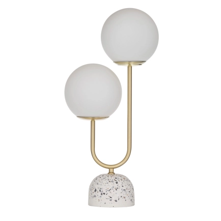 The Tivoli table lamp is a stunning, sophisticated table lamp. The base features terrazzo with a gold-coloured stands to complement. The highlight of this lamp is the two light bulbs, creating a statement piece. Place around your home for a lovely lighting feature.