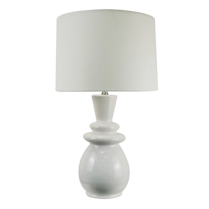 The White Ribbed Urn Bloomingdale ceramic table lamp comes complete with a white drum fabric shade. This designer lamp is perfect for a living room or side table in a modern or contemporary styled home. THIS PRODUCT IS NOT AVAILABLE FOR SHIPPING DUE TO HIGH RISK OF DAMAGE TO THE SHADE. IN-STORE ONLY PURCHASE.
